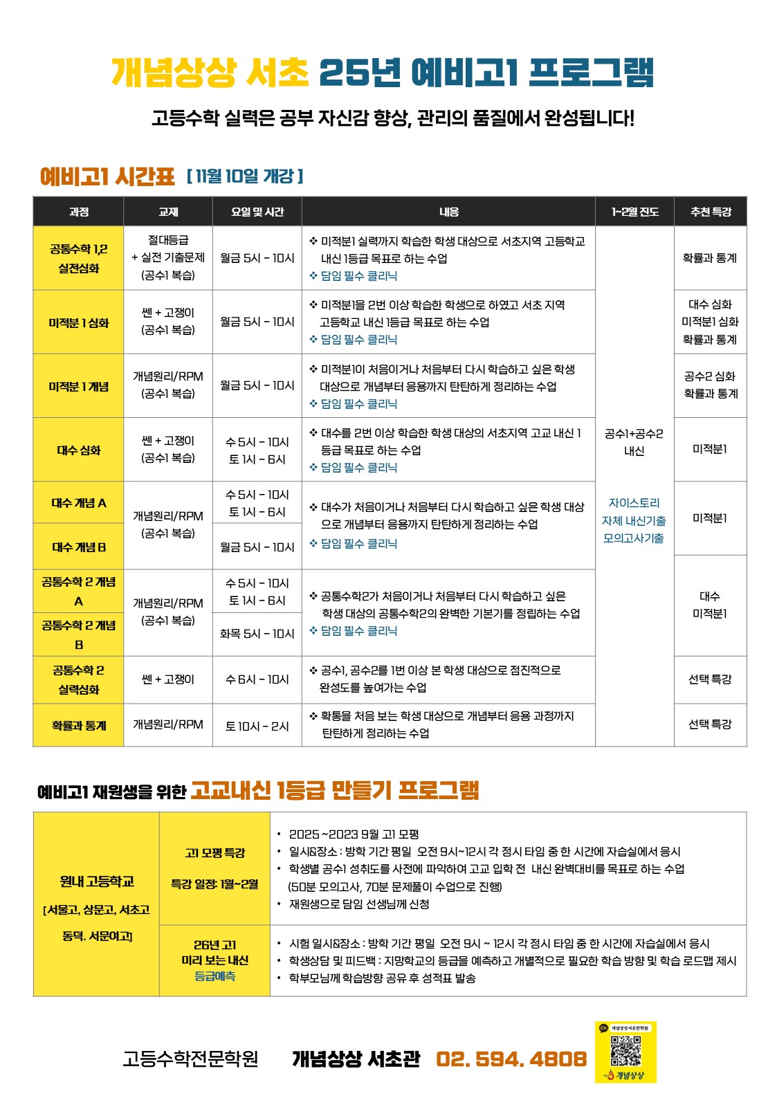 ■ 고1, 고2 정규반 시간표